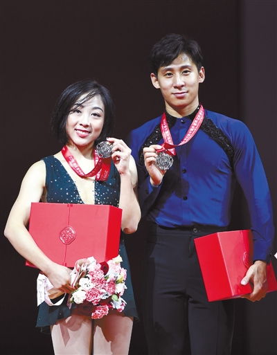 11月9日,冠军中国选手隋文静(左)/韩聪在双人滑颁奖仪式上。当日,在重庆举行的2019中国杯世界花样滑冰大奖赛双人滑比赛中,中国选手隋文静/韩聪以228.37分的总成绩夺得冠军。 新华社记者 薛玉斌 摄
