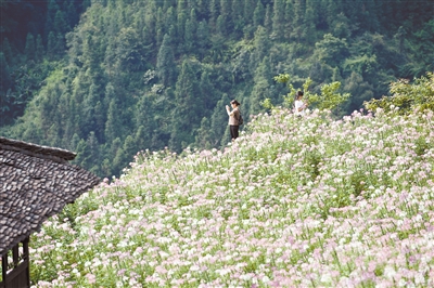 7月6日,游客在龙胜各族自治县泗水乡周家村布尼梯田鲜花丛中拍照。近日,广西龙胜各族自治县泗水乡周家村布尼梯田种植的近千亩鲜花竞相开放,美不胜收。