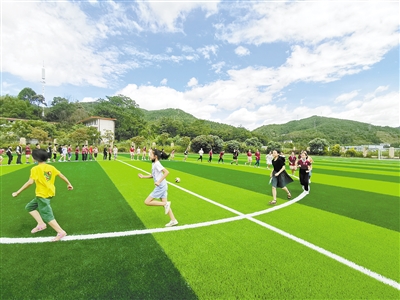永定区坎市镇公共足球场项目位于彩金实验小学校园西侧,为11人制F1FA国际标准足球场,今年3月份动工,目前已完工。图为近日彩金实验小学学生在球场运动的场景。
