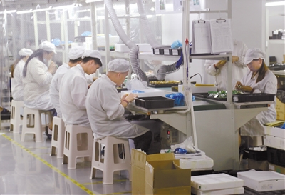 在武平县工业园区,福建希恩凯电子有限公司的员工正在模组组装