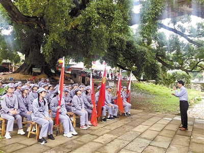近日,连城团县委组织青年团干代表前往连城县新泉镇开展“重走红军路 追寻红军魂”主题团日活动。图为“大榕树讲坛”红色宣讲员在新泉大榕树下为青年团干讲述党史故事。 记 者 赖菲