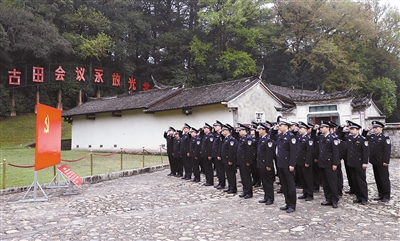 全市公安机关聚焦本色、用好红色、突出特色,不断强化党性教育,打造“四个铁一般”过硬公安铁军。图为民警在古田会议会址前重温入党誓词。