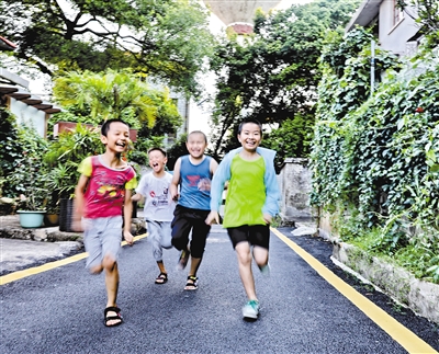 孩童们在平坦整洁的林荫道上追逐嬉闹。
