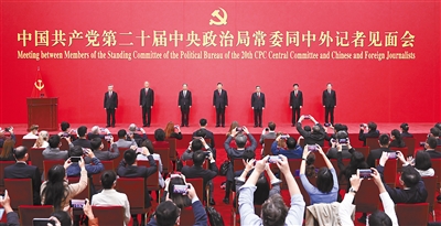 10月23日,刚刚在中国共产党第二十届中央委员会第一次全体会议上当选的中共中央总书记习近平和中共中央政治局常委李强、赵乐际、王沪宁、蔡奇、丁薛祥、李希在北京人民大会堂同采访中共二十大的中外记者亲切见面。 新华社记者 申宏 摄