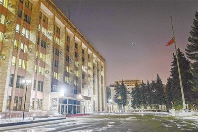 11月30日,中国驻俄罗斯大使馆下半旗志哀,悼念江泽民同志逝世。 新华社发