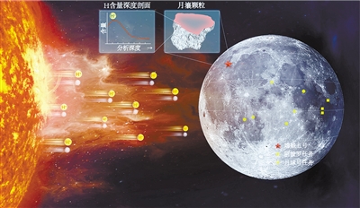嫦娥五号月壤揭示太阳风为月球带来可利用的水。这张示意图显示了来自太阳表面的高速氢离子注入到月球表面并富集在月壤颗粒表层。 新华社发(中国科学院地质与地球物理研究所供图)