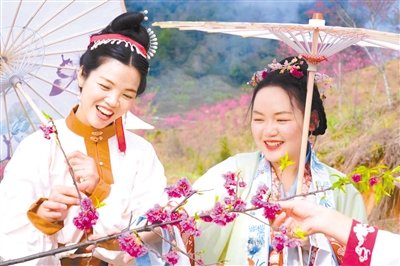 日前,永定区龙潭镇枫林村的山坡上,一千多株樱花树竞相开放,随着山坡蜿蜒,美不胜收,吸引不少“晒春”的市民前往拍照、观赏。近年来,龙潭镇依托良好的生态环境,大力推动生态农业发展,做好生态农业的“花”样文章。图为市民身着汉服在樱花树下赏玩。融媒体记者 傅长盛 通讯员 黄秋萍 摄