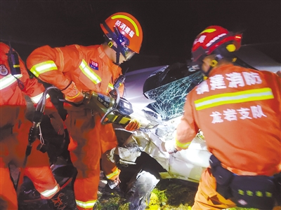 6月12日晚,新罗区大锦山发生一起车祸,龙岩经济技术开发区消防救援大队接到报警后立即赶赴现场,经过30分钟的紧急救援,成功将被困人员救出,并交由120医护人员送医救治。目前,事故原因正在进一步调查中。图为救援现场。融媒体记者 余雅丽 通讯员 王慧琴 摄