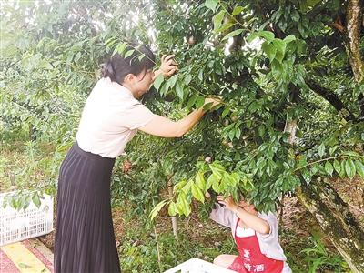 图为廖雪涵正在果园检查李子的成熟度,准备酿酒材料。