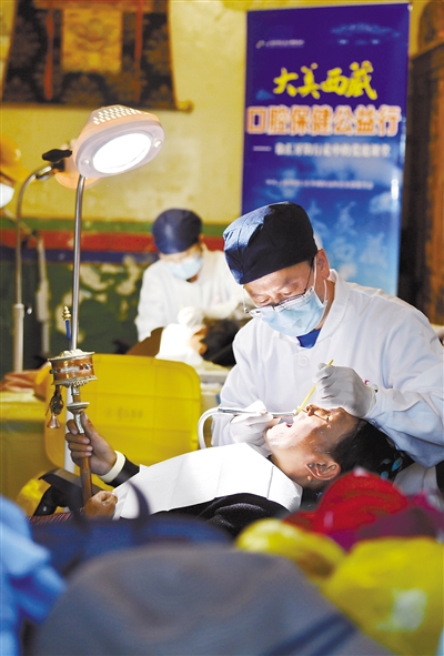 上海市徐汇区牙病防治所医生孙兵为一名牙病患者拔牙(7月8日摄)。近日,上海市徐汇区牙病防治所的医务工作者来到西藏浪卡子县普玛江塘乡,为当地居民普及口腔保健知识并进行义诊服务。普玛江塘乡海拔5373米,是我国海拔最高的乡。 新华社记者 张汝锋 摄