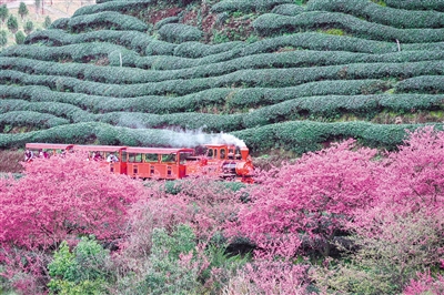 “老广们”在漳平樱花园乘小火车、赏樱花。 融媒体记者 谢泽铧 方晨颖 摄