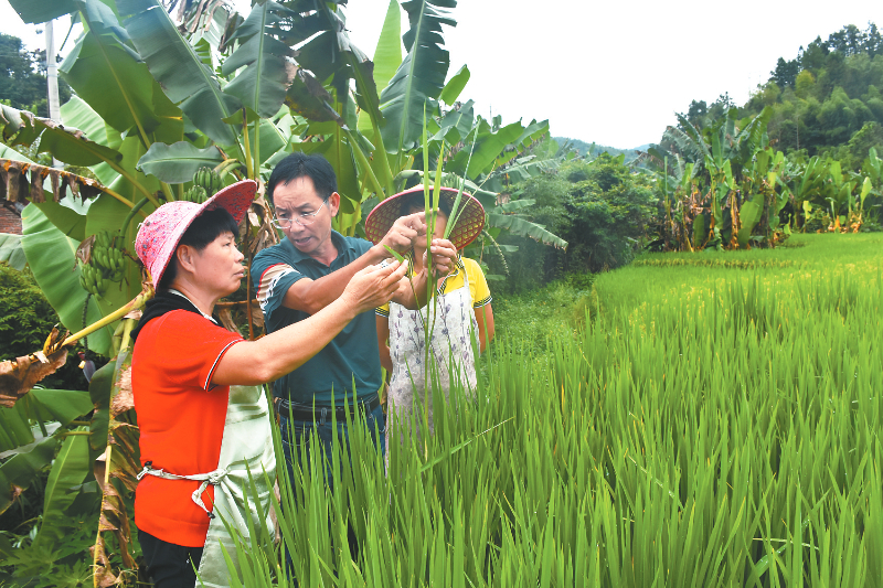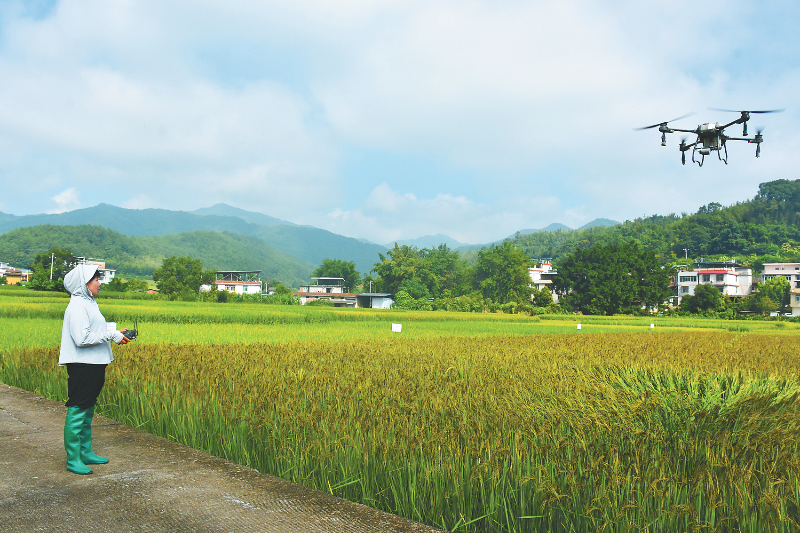 日前,永定区坎市镇文管水稻种植基地,种植户卢才娘在操纵无人机给郁郁葱葱的水稻打药,并认真听取水稻专家讲解病虫害防治。