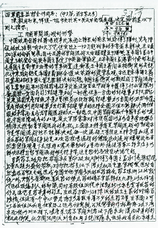 《中共中央给红军第四军前委的指示信》第1页原始照片