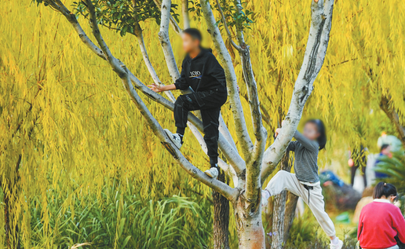 元旦假期期间,部分景区出现了一些不文明行为,不仅影响景区观瞻,部分行为还具有一定的危险性。图为游客在景区内爬树。融媒体记者 章宸睿 摄