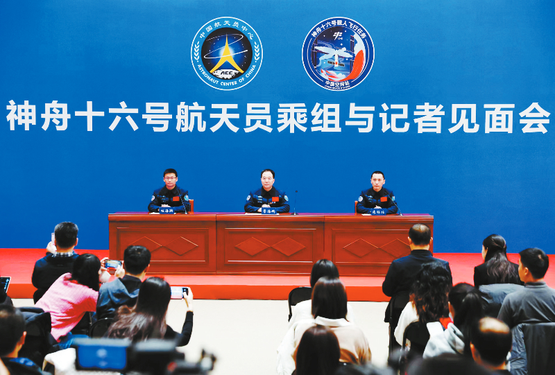 1月19日下午,中国航天员科研训练中心在北京航天城举行神舟十六号航天员乘组与记者见面会。景海鹏、朱杨柱、桂海潮3名航天员从太空返回80天后首次正式公开亮相。 新华社发 韩海丹 摄