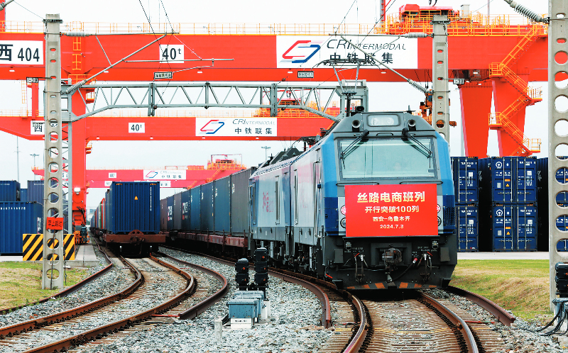 7月3日,X387次丝路电商班列在西安国际港站准备发车。自2024年3月首开以来,西安至乌鲁木齐丝路电商班列累计开行突破100列,为有效降低社会物流成本、服务快递电商发展提供了有力支撑。新华社记者 梁爱平 摄