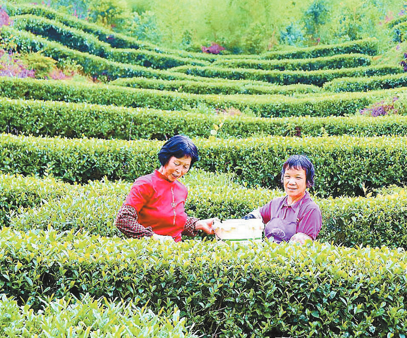 近日,长汀县新桥镇石人村的生态茶园里,10多名采茶村民拿着箩兜,穿梭茶林之间,抢抓时令采摘茶叶,勾勒出一幅景美人和产业兴旺的怡人画卷。 通讯员 黎寿钦 摄