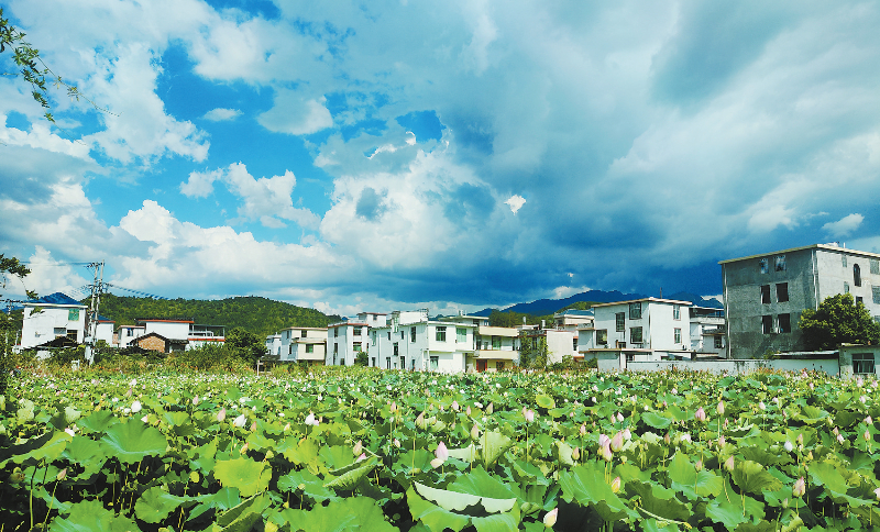 百亩荷花竞相绽放,碧绿的荷叶如盖,荷花或含苞待放,或含芳吐蕊,粉中透白的花瓣在清风中摇曳生姿,香气远播,与村中的文昌阁、永隆桥等古朴建筑相映成趣,共同绘制出一幅动人的夏日田园画卷。