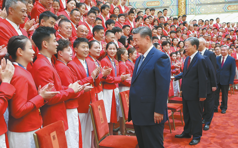 八月二十日,党和国家领导人习近平、赵乐际、王沪宁、蔡奇、李希、韩正等在人民大会堂接见第三十三届夏季奥林匹克运动会中国体育代表团全体成员。 新华社记者 鞠鹏 摄