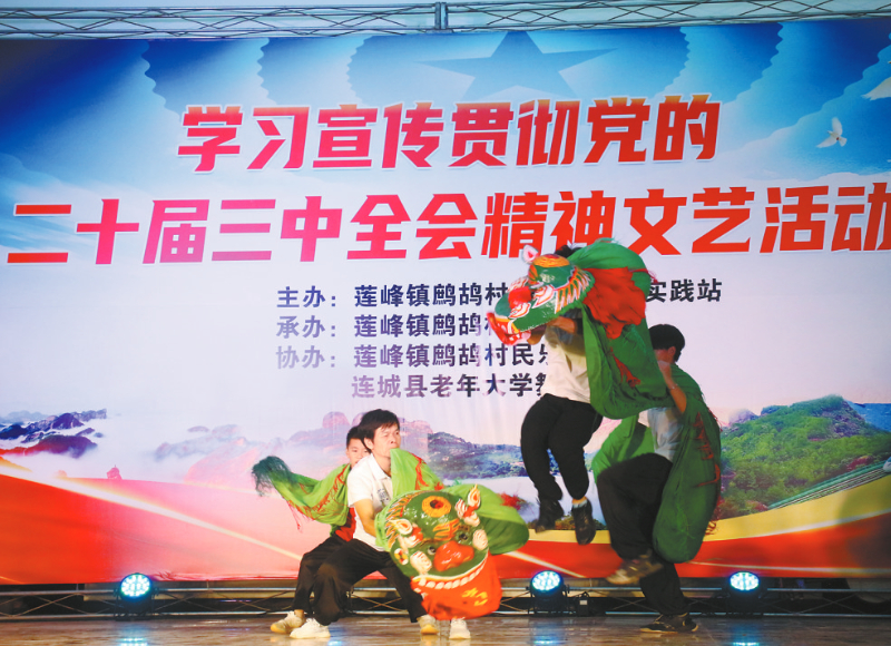 本报讯(通讯员 黄水林 李娟 文/图)8月14日晚,连城县莲峰镇鹧鸪村结合传统民俗活动,举办学习宣传贯彻党的二十届三中全会精神文艺活动,以群众喜闻乐见的非遗文化艺术、歌唱舞蹈,向群众零距离宣传党的二十届三中全会精神,丰富村民文化精神生活,推进平安和谐鹧鸪建设。