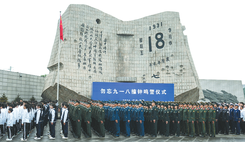 这是9月18日拍摄的“勿忘九一八”撞钟鸣警仪式现场。今年是“九一八”事变爆发93周年。9月18日上午,“勿忘九一八”撞钟鸣警仪式在沈阳“九·一八”历史博物馆残历碑广场举行。新华社记者 潘昱龙 摄