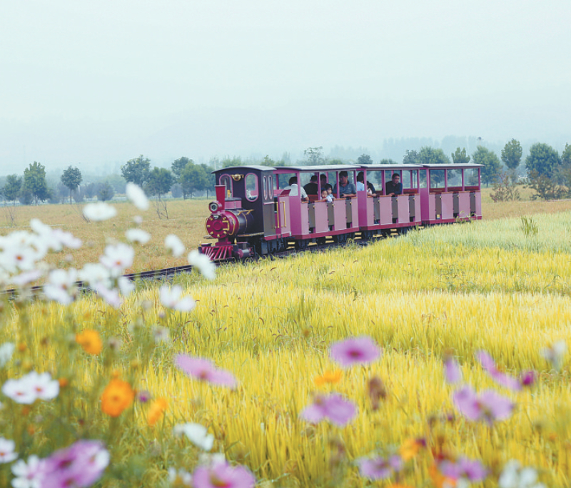 9月15日,在河南省洛阳市汝阳县三屯镇东保村“稻田小镇”,游客乘坐小火车在稻田旅游观光。9月18日,文化和旅游部发布数据显示,今年中秋节假期,全国国内出游1.07亿人次,按可比口径较2019年同期增长6.3%;国内游客出游总花费510.47亿元,较2019年同期增长8.0%。新华社发 康红军 摄