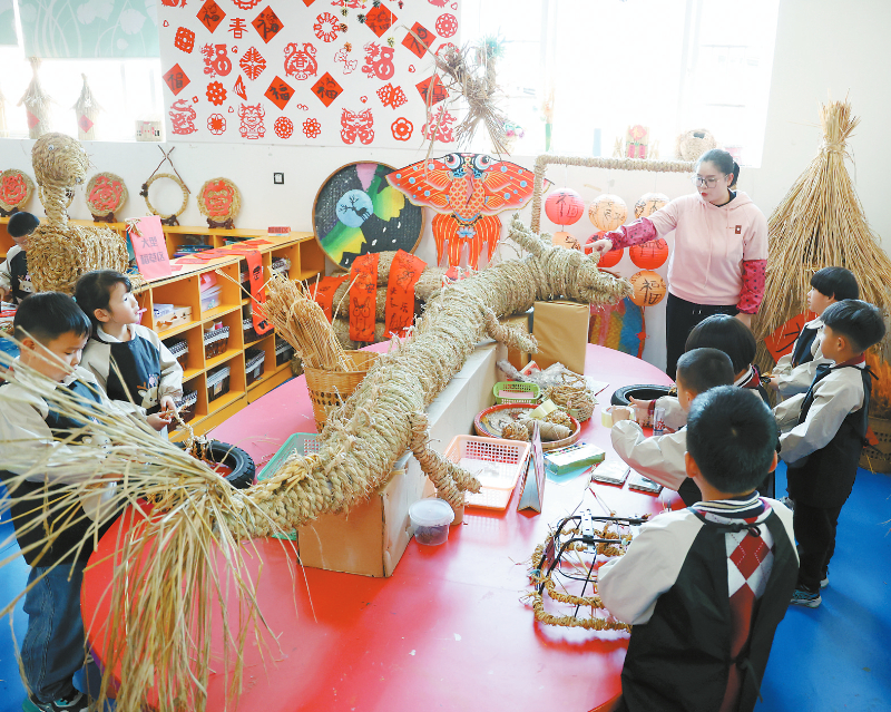 永定凤城中心幼儿园注重开展在乡土文化中融入劳动教育的实践研究,根据幼儿的实际生活经验,把各种社会劳动角色及基本劳动技能融入到实践操作和游戏中,让幼儿体验到劳动和创造的快乐,如让孩子们学习古人夯墙、建造“土楼”、搭建“龙湖大桥”等。图为孩子们学习稻草编织传统工艺。 曾志明 苏晓娟 摄