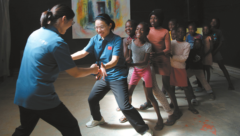 11月20日,在纳米比亚首都温得和克附近的弗兰斯艺术培训中心,中国医生与孩子们做游戏。11月20日是世界儿童日,第十六批中国援纳医疗队的四名队员一早就来到了距离首都温得和克20多公里的弗兰斯艺术培训中心,为在此就读的45名生活在贫民区的孩子进行身体和口腔健康检查,并给孩子们准备了学习用品、绘画工具和食品。新华社记者 陈诚 摄