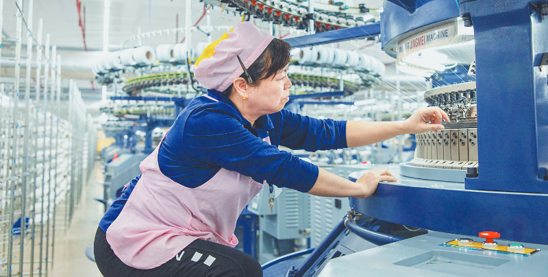 近日,在新兴新纺织科技(龙岩)有限公司的生产车间现场,现代化、智能化生产线映入眼帘,随着上千根细丝高速旋转进入机器后,迅速交织成布,该企业位于新罗区(厦龙合作区)北部新城龙雁经济开发区,是一家集针织产品织造、印染、研发生产于一体的大型纺织印染企业,该企业年产各类纺织品3万吨以上,年产值约18亿元。融媒体记者 章宸睿 通讯员 谢雯 摄