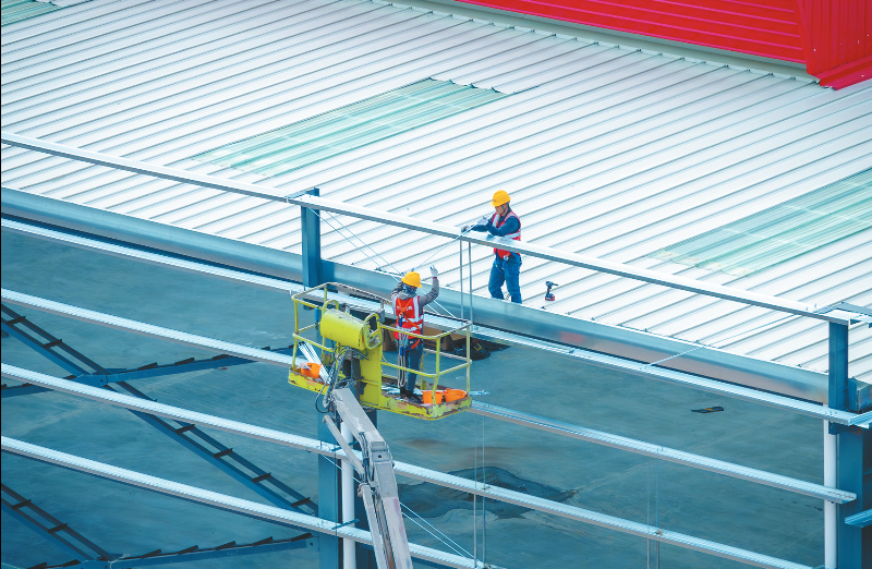 图为工人师傅在安装厂房外墙檩条拉杆。