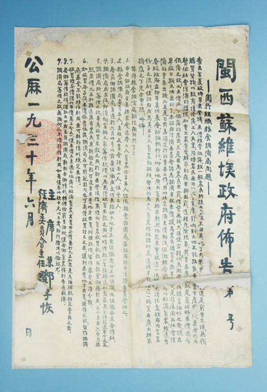 这是一份1930年6月,由闽西苏维埃政府颁布的“关于组织粮食调济局问题”的布告。布告长62.5厘米,宽43.5厘米,重18克,属国家一级文物,现收藏于长汀县博物馆。系于1988年由长汀县策武乡李田村王长庆捐赠。