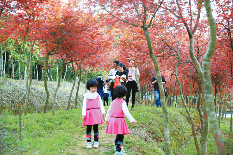 近日,连城县文亨镇星光生态旅游度假区科普园50多亩红枫林里,带着孩子来观赏游玩的游客络绎不绝。据介绍,该园种植的这种红枫春季满树火红,到了夏季则会出现部分叶片由红转绿的现象。该树种红叶观赏周期长,神奇的“变色”过程还具科普性。目前,景区正处于升级改造阶段,仅对有预约的青少年开放。通讯员 邹善水 黄力军 摄
