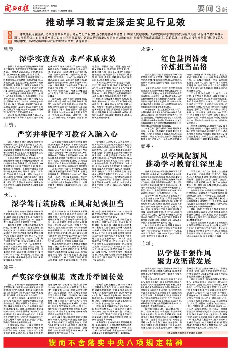 以上率下统筹推进。漳平市委充分发挥“头雁领航”作用,召开党的建设工作领导小组会议,研究部署深入贯彻中央八项规定精神学习教育工作,为学习教育锚定方向、划出重点。同时,通过举办市委学习教育读书班,采用专题辅导、集中学习、交流研讨和个人自学相结合的方式,为全市各级党组织立标杆、作示范,推动全市75个党委实现学习教育“全覆盖、穿透式”开展,确保学习教育在漳平落地生根。