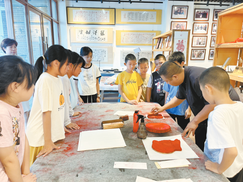 7月7日,连城县总工会2025年职工子女暑托班在观摩、学习非遗四堡雕版印刷技艺。暑托班在连城城区设立3个教学点6个班次服务289名职工子女,为期四周。除学业辅导外,特别融入心理关怀、户外活动、儿童发展等特色内容。 通讯员 李聪妹 蒋淑梅 摄