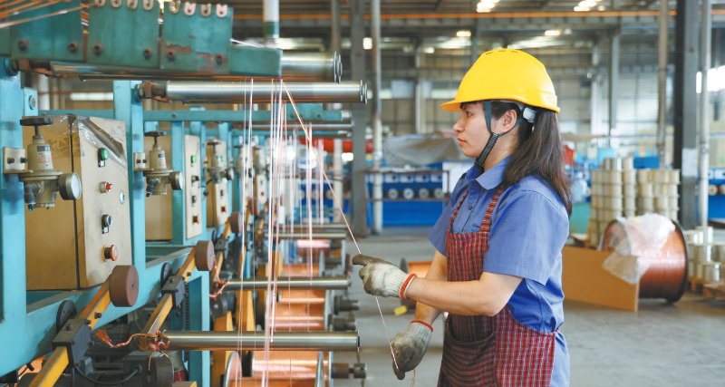 近日,位于上杭工业园区南岗金铜产业园的太阳铜业有限公司生产车间内机器轰鸣,一块块铜板经多道工序,加工成铜杆、铜线等铜产品。据了解,该公司依托上杭丰富的金铜矿资源,深耕铜精深加工领域,实现产品高附加值优化升级,上半年产量约7万吨,产值约48.8亿元。与壹动铜业共同投资建设的年产5万吨漆包线生产项目,现已完成生产厂房整体改造,将填补上杭县漆包线产业的空白。龙媒体记者 谢泽铧 摄