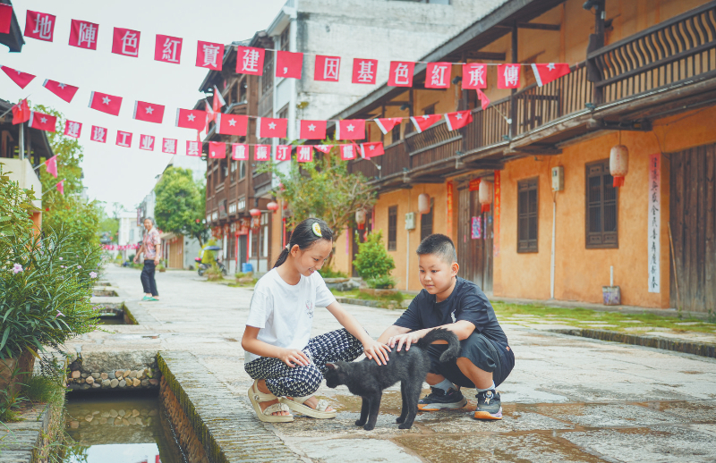 图为水口村红军街上,孩子们正在与小猫互动。