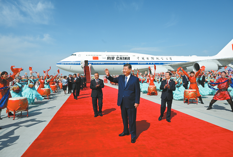 新疆维吾尔自治区党委书记陈小江、自治区人民政府主席艾尔肯·吐尼亚孜、自治区人大常委会主任祖木热提·吾布力、自治区政协主席努尔兰·阿不都满金、新疆生产建设兵团政委何忠友等在舷梯下迎候。习近平走下舷梯时,少先队员献上鲜花。各族群众代表身着民族服饰,载歌载舞,欢迎总书记的到来,表达对总书记的衷心祝福。