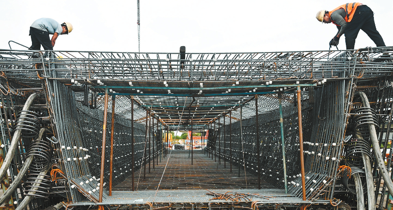 10月27日,工人在中铁十一局沪渝蓉高铁沪宁段搬经制梁场作业。近日,中铁十一局沪渝蓉高铁沪宁段搬经制梁场的箱梁预制任务进入收尾阶段,各项作业有序进行。截至目前,搬经制梁场共预制箱梁847榀。沪渝蓉高铁是我国“八纵八横”高铁网沿江高铁通道的重要组成部分。新华社记者 季春鹏 摄