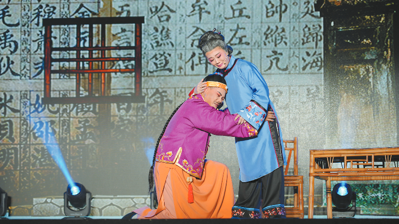 图为二○ 二五客家戏剧周暨闽粤赣民营剧团交流演出中由武平县汉剧艺术传承保 护中心表演的闽西汉剧《百姓镇轶事》选段