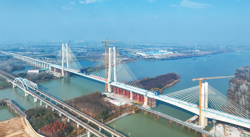 12月19日拍摄的通泰扬特大桥跨京杭运河斜拉桥合龙施工现场。当日,由中国铁建大桥局承建的沪渝蓉高铁通泰扬特大桥跨京杭运河斜拉桥顺利合龙,通泰扬特大桥控制性工程取得突破性进展。本次合龙的跨京杭运河斜拉桥位于江苏扬州,全长564.3米,主跨300米,主塔高128米,桥面距离航道水位约30米。