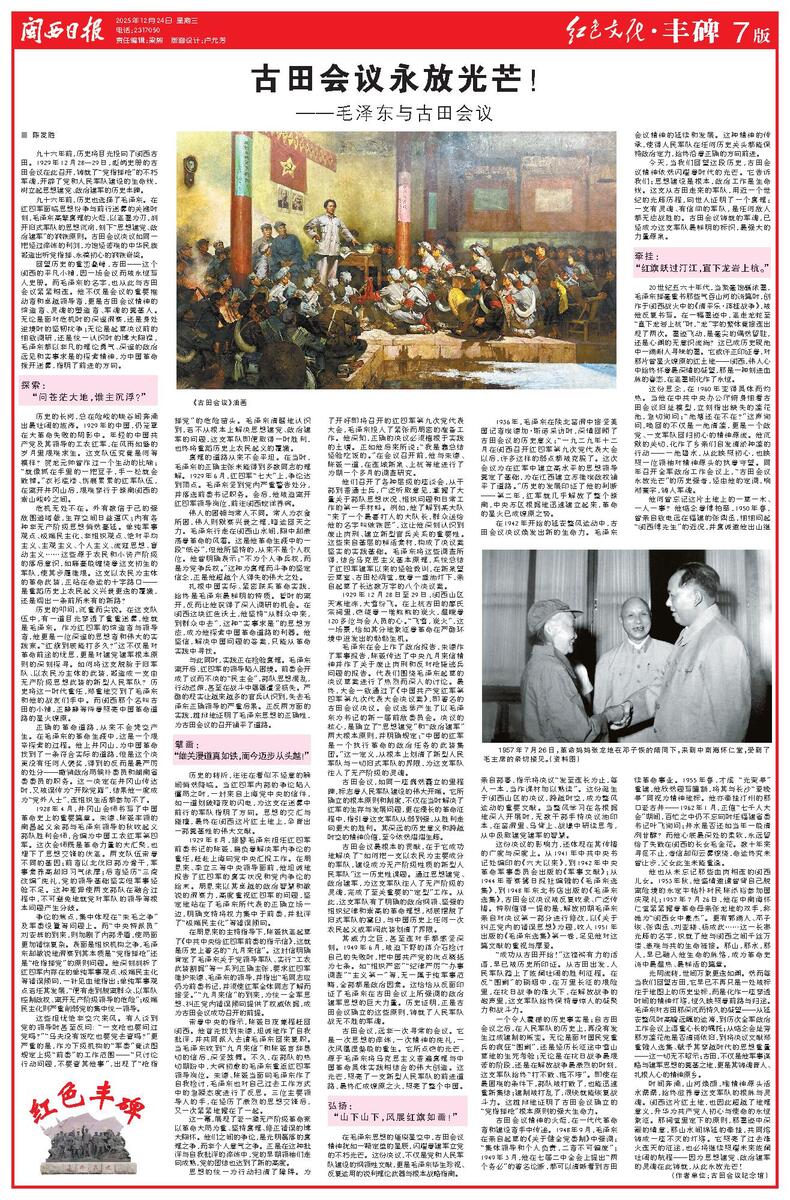 1936年,毛泽东在陕北窑洞中接受美国记者埃德加·斯诺采访时,深情回顾了古田会议的历史意义:“一九二九年十二月在闽西召开红四军第九次党代表大会以后,许多这样的弱点都被克服了。这次会议为在红军中建立高水平的思想领导奠定了基础,为在江西建立苏维埃政权铺平了道路。”历史的发展印证了他的判断——第二年,红军就几乎解放了整个赣南,中央苏区根据地迅速建立起来,革命的星火已成燎原之势。