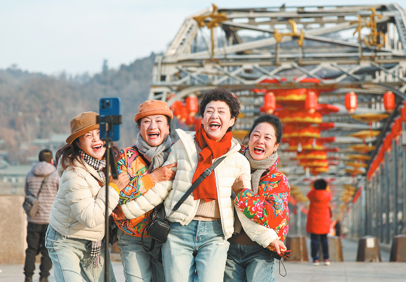 2月9日,游客在兰州市城关区中山桥前拍照。新春佳节临近,有着上百年历史的甘肃兰州黄河铁桥——中山桥上挂起大红灯笼,营造出红红火火的迎新氛围。新华社发 侯崇慧 摄