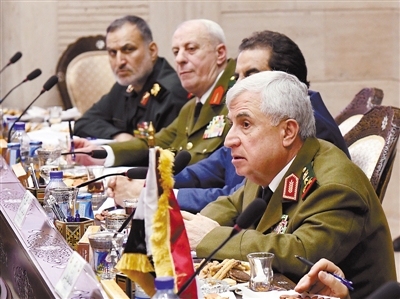 叙利亚国防部长阿里·阿卜杜拉·阿尤布、伊朗武装部队总参谋长穆罕默德·巴盖里和伊拉克政府军总参谋长奥斯曼·加尼米18日在叙首都大马士革举行会晤,就反恐合作、开放边界、叙局势发展等问题进行磋商。 新华社发(阿马尔摄)