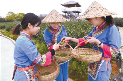 3月24日,采茶姑娘在福鼎市点头镇大坪村的六妙白茶生态茶园观看新采的茶青质量。