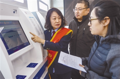3月24日,在河北省廊坊市广阳区税务大厅,导税员指导企业办事人员利用办税自助服务机办理业务。
