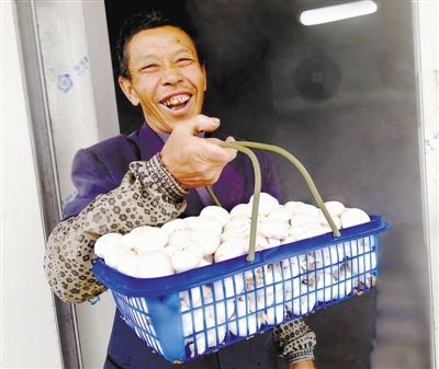 菇农看着刚采摘的双孢菇笑逐颜开