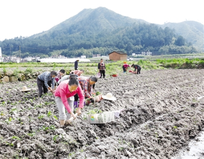 10日下午,连城县姑田镇后洋村的连片大田里,当地农民正在种植地瓜。该项目是激励性产业扶贫项目,实行统一种苗、统一种植、统一指导、统一收购,在去年流转200亩土地的基础上,今年扩大到350亩,参与贫困户由去年的27户增加到70户。