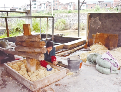 林友妹在纸寮碓制竹丝泥