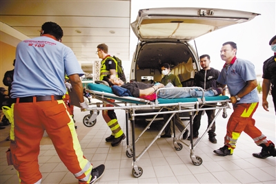 4月14日,在尼泊尔加德满都,人们将伤者送到医院。尼泊尔一架小型飞机14日在珠穆朗玛峰南坡的卢卡拉机场起飞时撞上一架停在地面的直升机,造成至少2人死亡。 新华社发