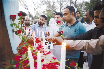 4月21日,在巴基斯坦白沙瓦,人们点燃蜡烛悼念斯里兰卡爆炸遇难者。